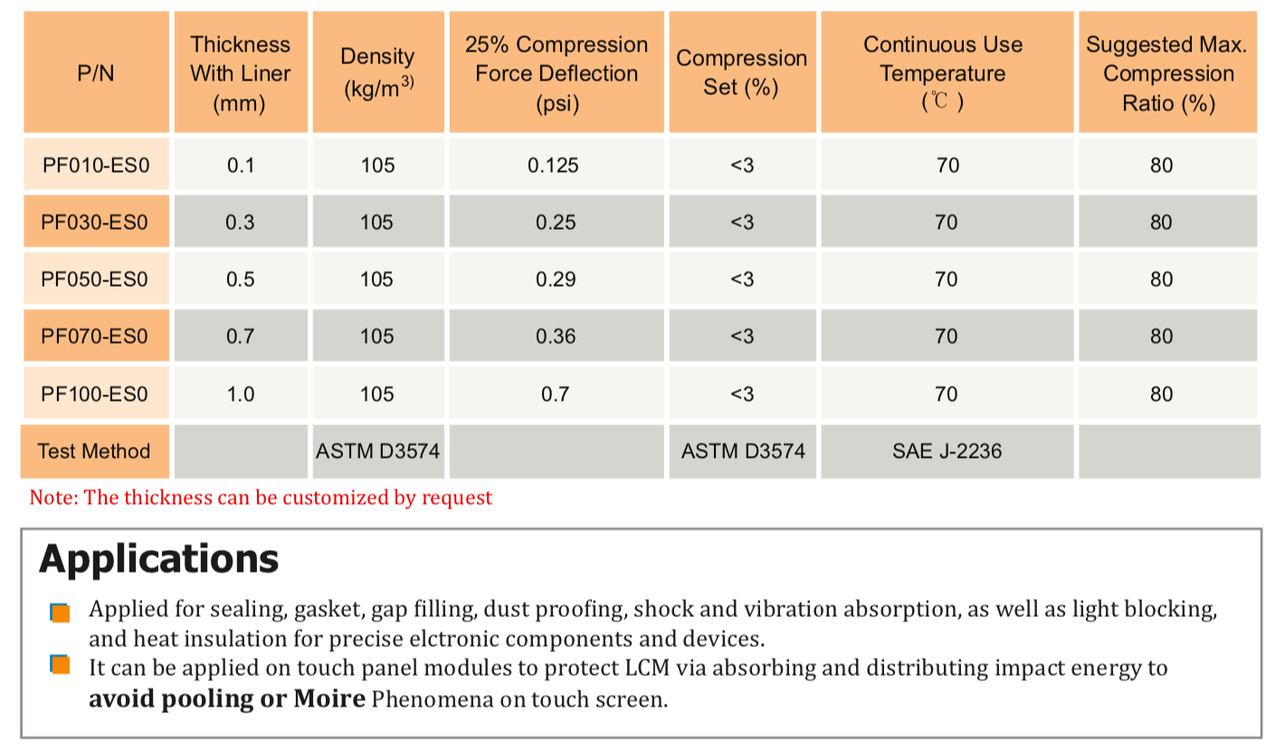 TM PF-ES0 系列是一種非常柔軟、低密度且緩慢回彈的PU泡棉,用于電子設(shè)備應(yīng)用中的防塵、防液、隔光和隔音密封。它具有極佳的可壓縮性和順應(yīng)性。ES0系列具有非常低的壓縮永久變形率,還具有高密封性能,出色的沖擊吸收能力,非常適合用作LCD/TP防影(摩爾紋)解決方案以及揚(yáng)聲器墊圈、相機(jī)鏡頭密封、連接器緩沖墊、電池墊等。" />
